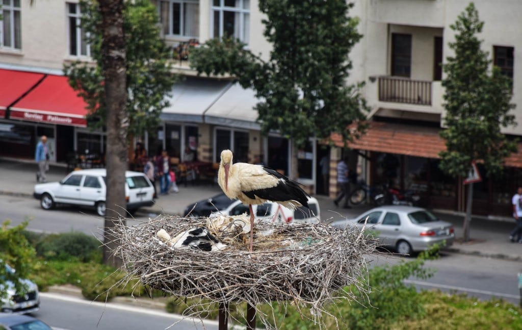 The birds are White Storks from Africa. They migrate 4,000 miles to Selcuk every year in late April or May to lay their eggs and hatch their chicks. They mate for life and rear their chicks together, returning to the same nest year after year.