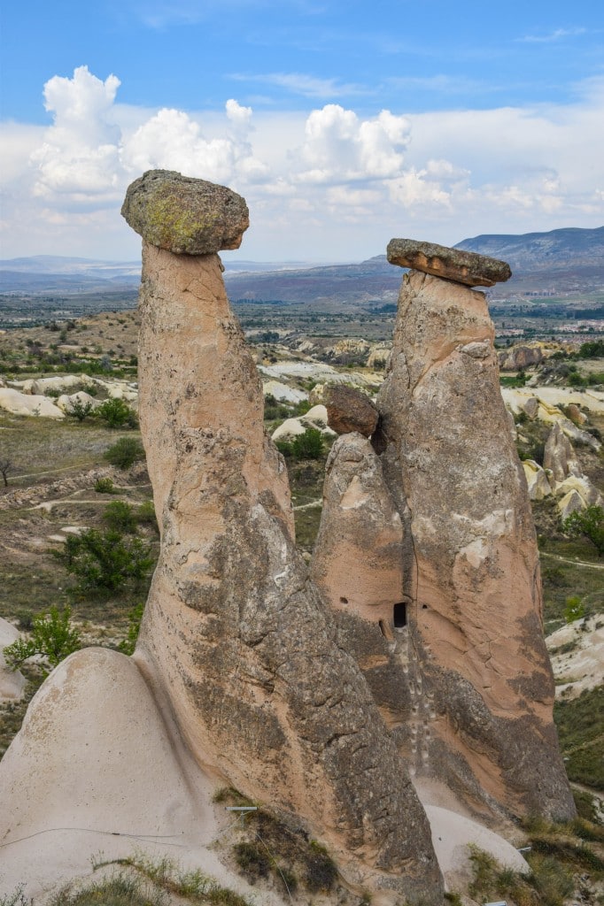Perhaps Cappadocia’s most unique geological features are the whimsical “fairy chimneys” – formed when harder rock above the tufa prevents erosion on the top but not the sides. Eventually, the cap falls off leaving the rest of the chimney to erode.